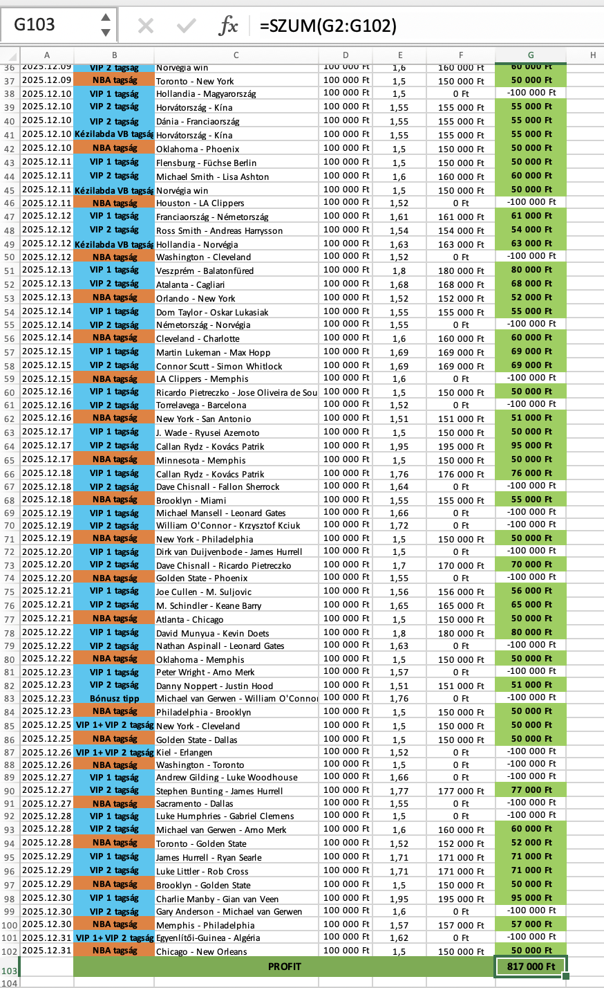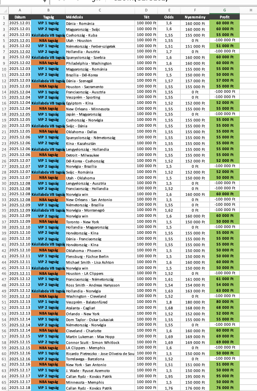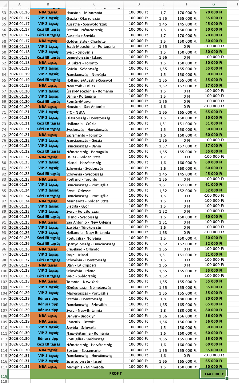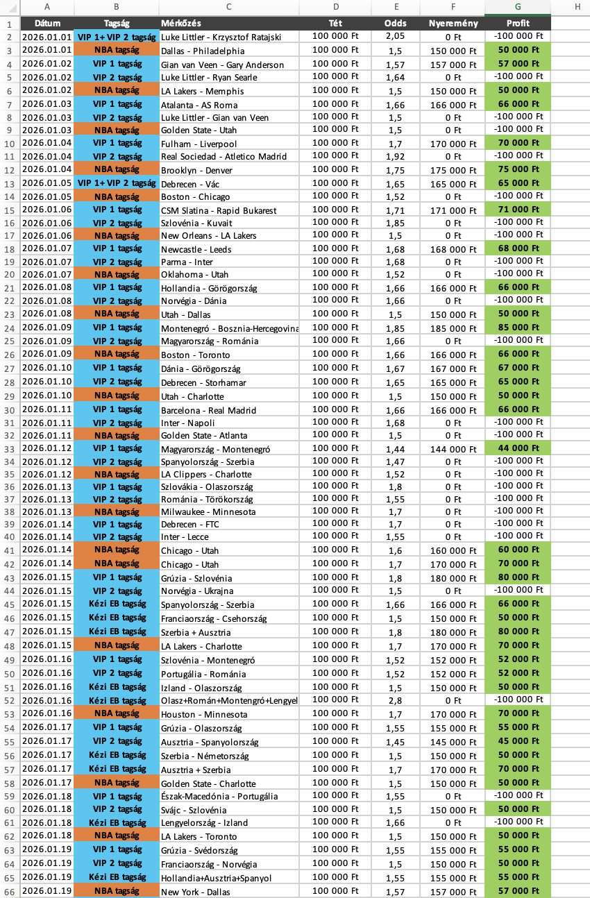 A statisztika 100.000 Ft-os alaptéten értendő! Fogadj mindig felelősséggel! Az aktuális hónap 15. napjától elérhető az adott havi statisztika!